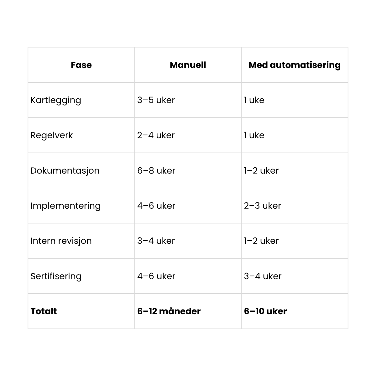 For selskaper som jobber med flere standarder (ISO 27001, ISO 45001, ESG), overlapper prosessene betydelig.