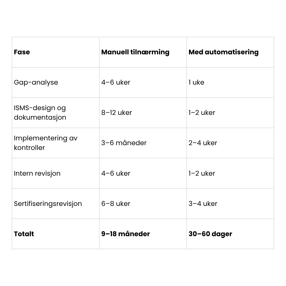 Hvis du har fått et estimat på 12–18 måneder og et stort budsjett for ISO 27001, har du fått et enterprise-svar på et spørsmål fra en vekstbedrift.